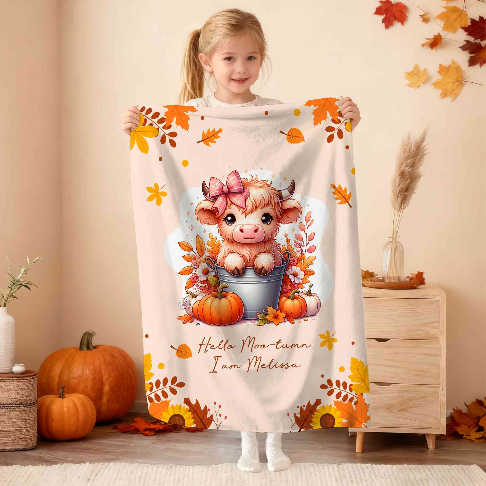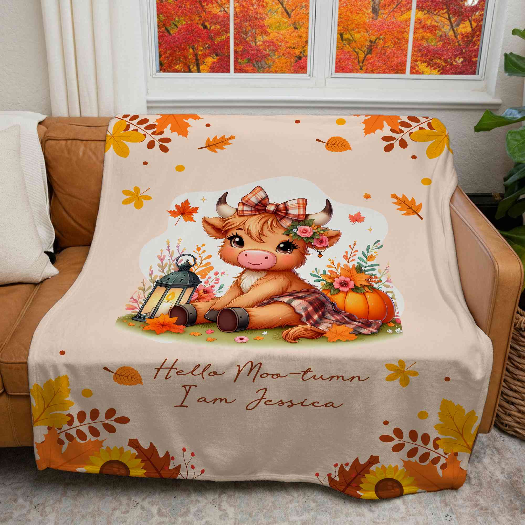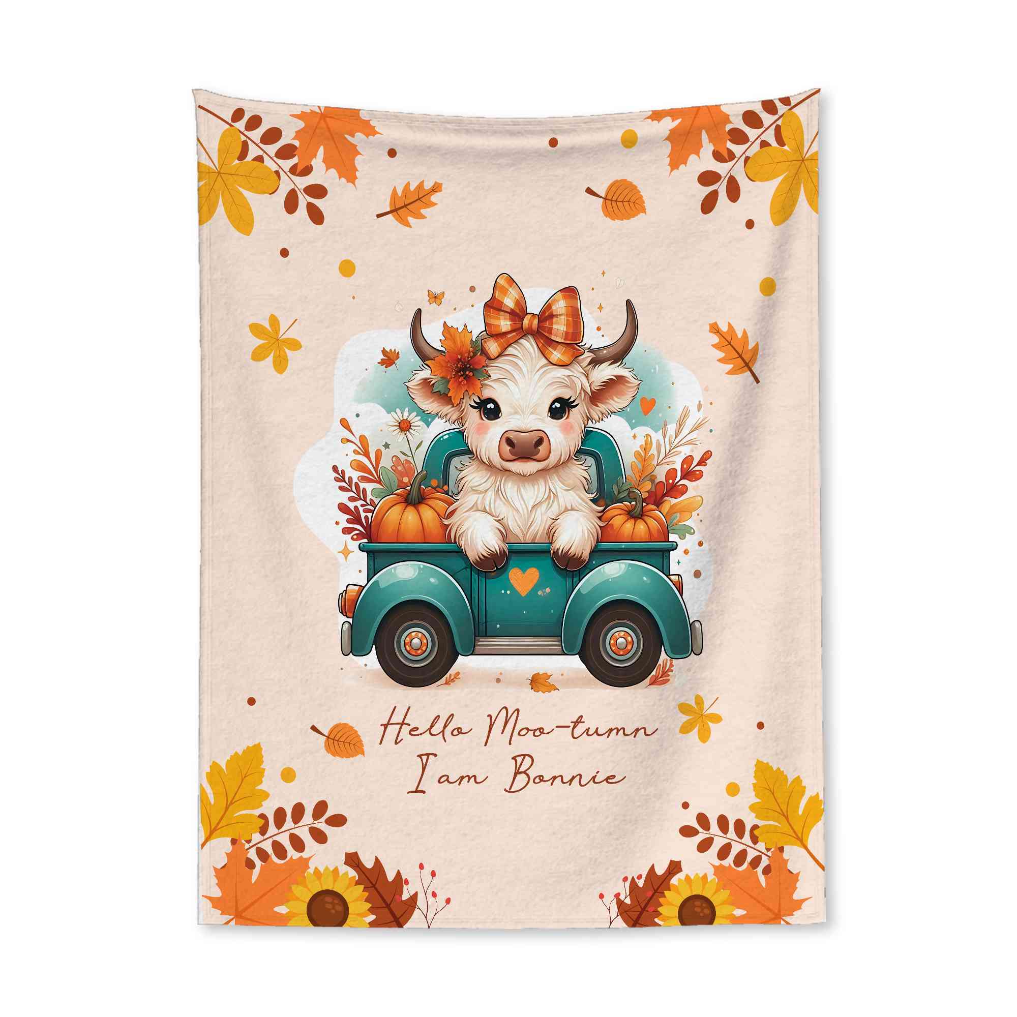 Customizable Charm - The Cute Highland Cow Autumn Pumpkin Blanket offers a delightful way to celebrate the fall season. With the option to personalize it with your name and select your favorite Highland Cow pattern, this blanket becomes a unique expression of your style and love for these adorable creatures.