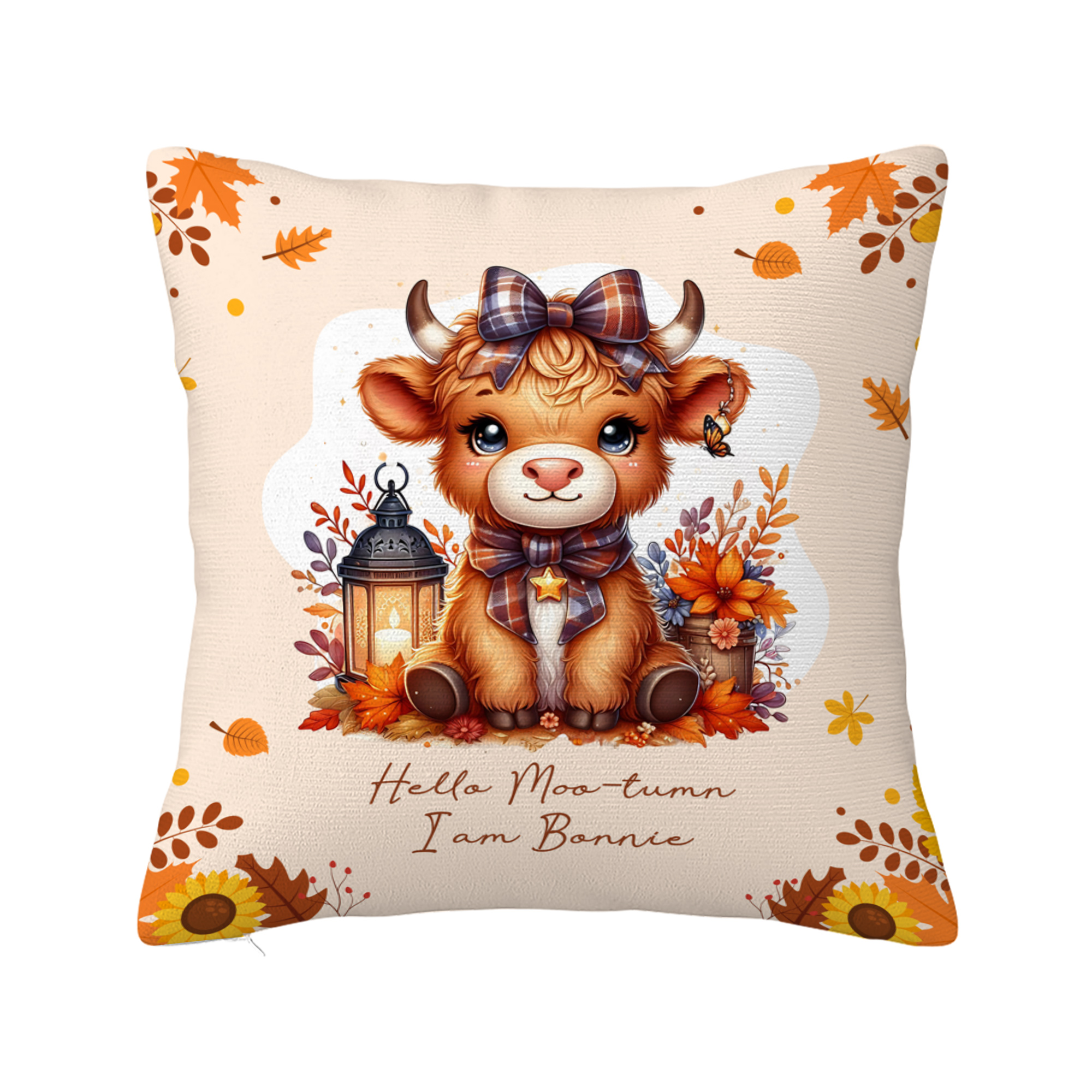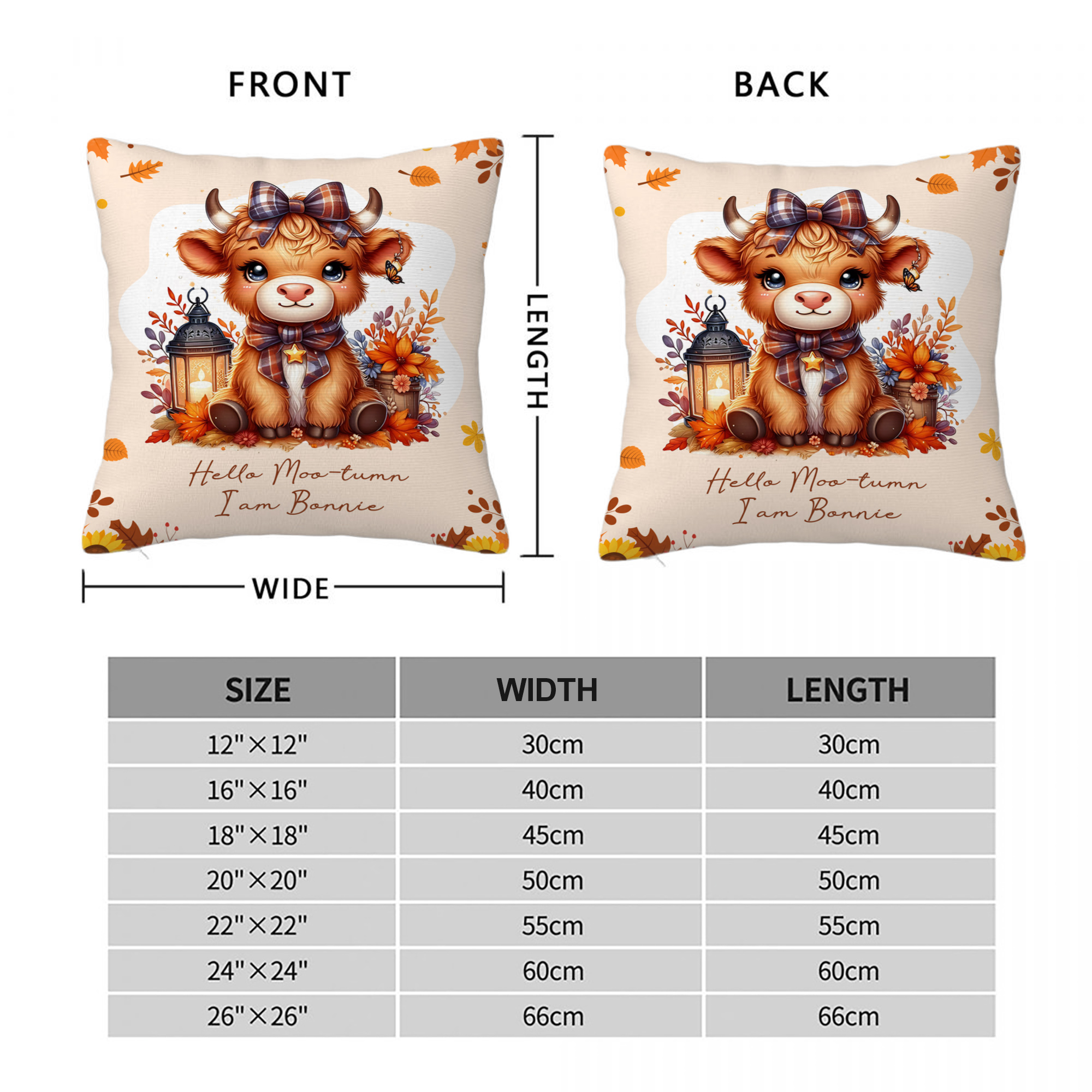 Personalised Name Autumn Highland Cow Pumpkins Soft Throw Pillow, Thanksgiving Pillow with Name, Thanksgiving Gift for Kid Woman, Home Decor