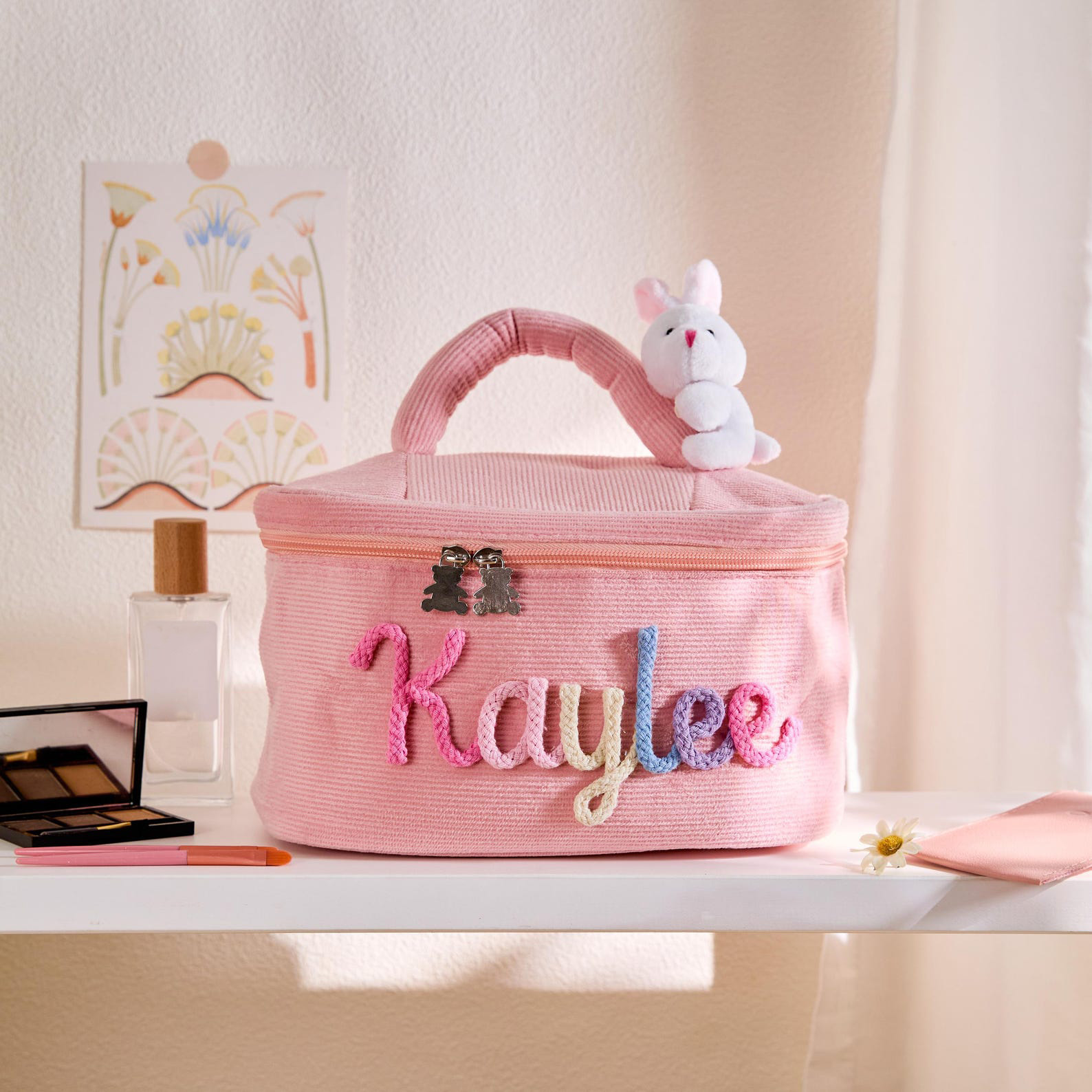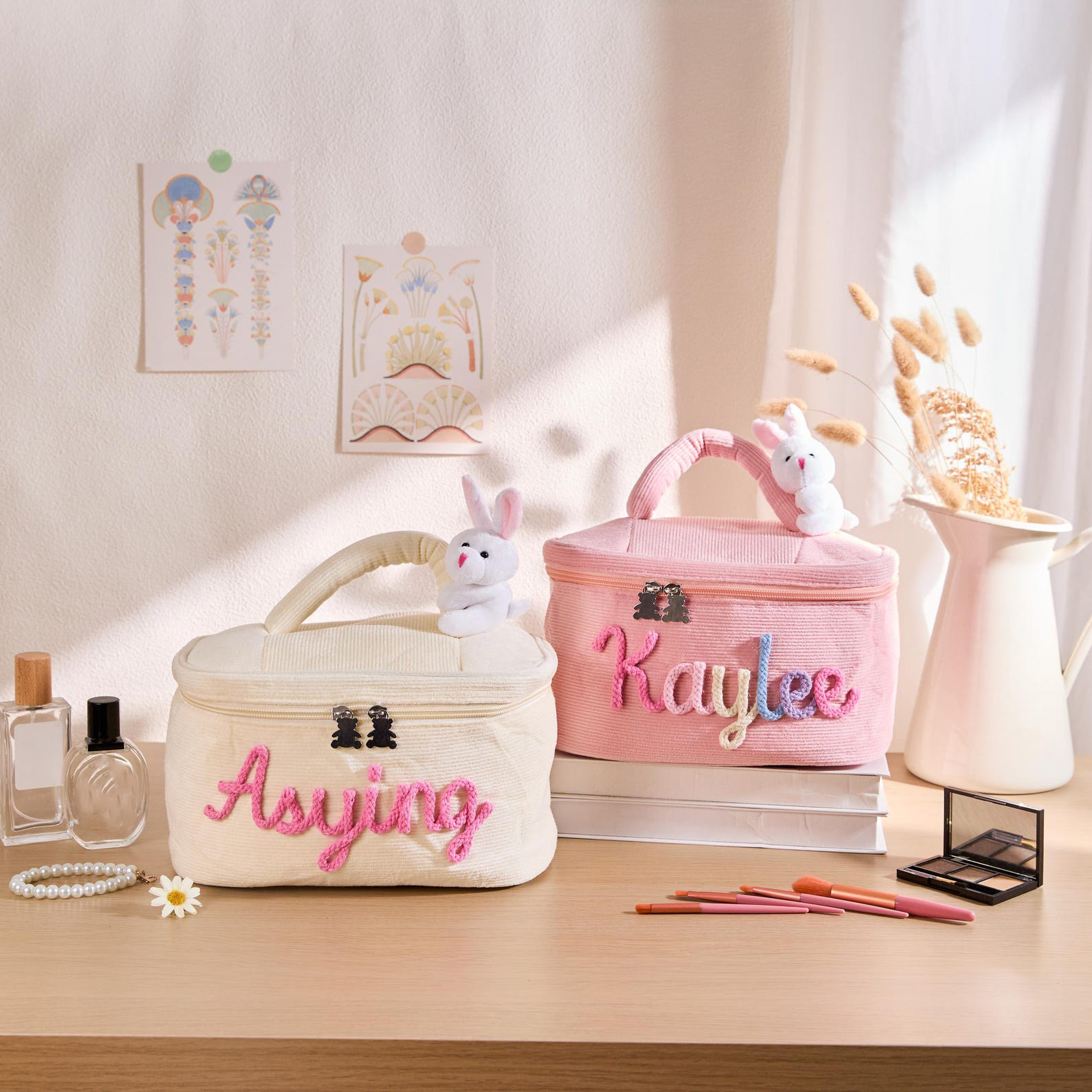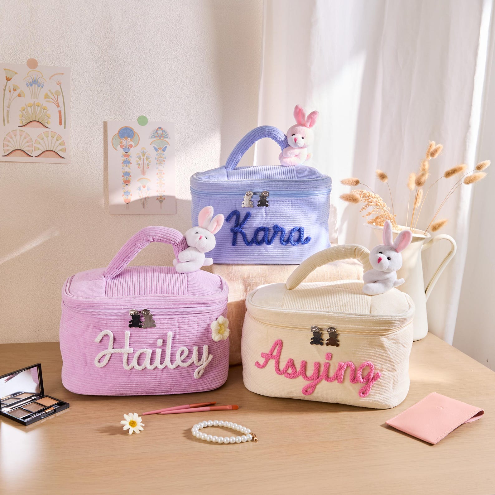 Personalized Name Yarn Embroidered Makeup Bag, Large Capacity Cotton Cosmetic Pouch with Fixed Bunny, Birthday/Easter Gift for Kids/Girls/Teens
