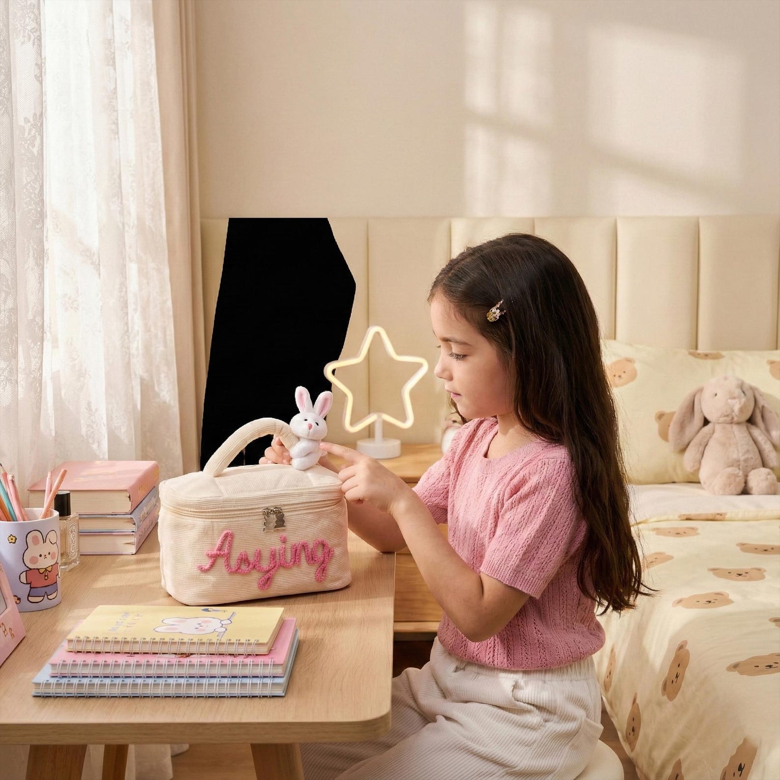 Cute Bunny Accent – A soft, plush bunny sits snugly on the handle of each bag, adding an extra dose of sweetness and personality. The fixed bunny detail brings a delightful sense of fun, making this pouch perfect for young girls who love cute accessories and imaginative play.