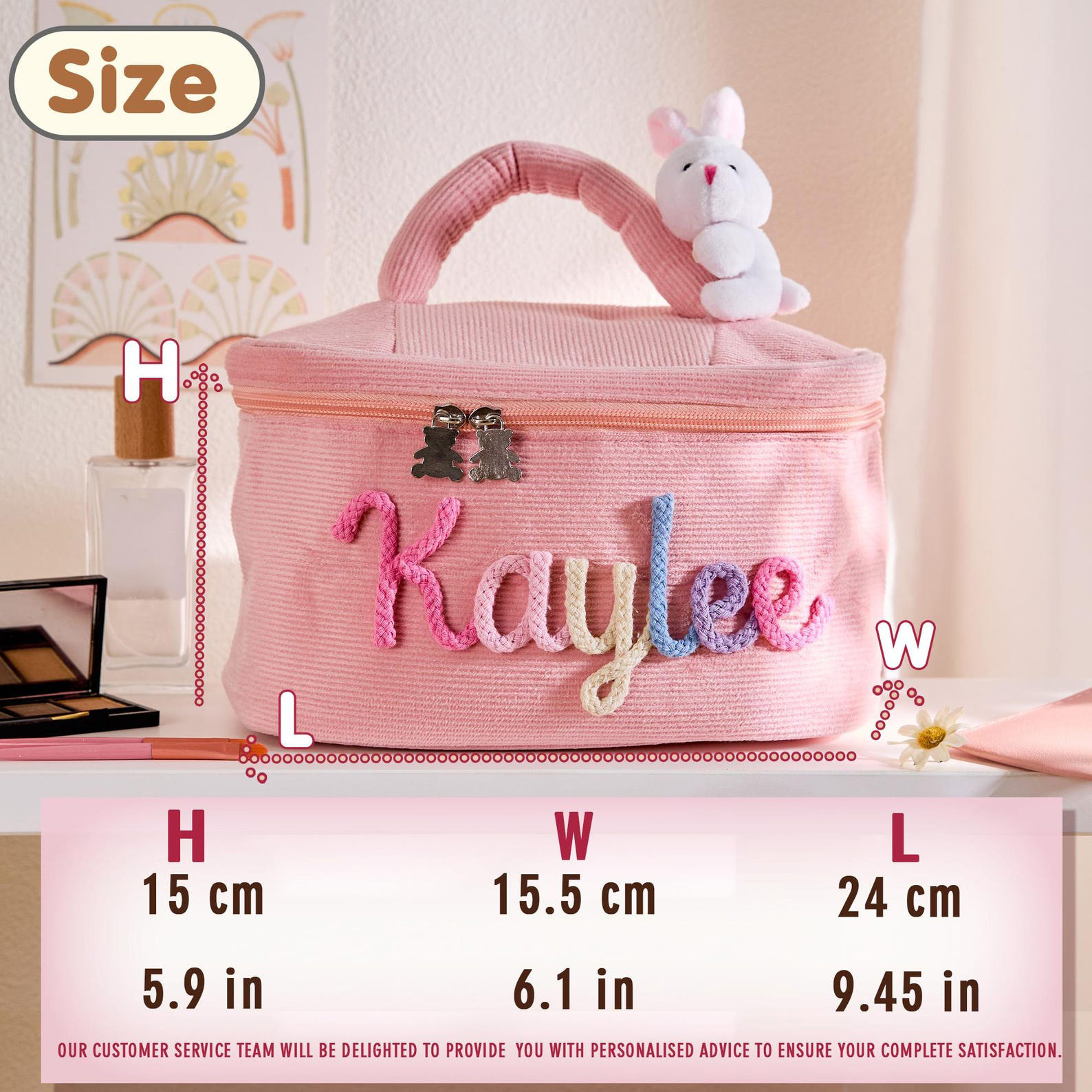 Adorable & Personalized Design – This charming cosmetic bag features a custom name—embroidered in colorful yarn with a playful, handcrafted look. Each letter is carefully stitched to create a unique and whimsical touch that makes the bag feel truly special and one-of-a-kind.